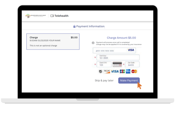 - If prompted, enter your credit card information in order to authorize the payment for your visit.